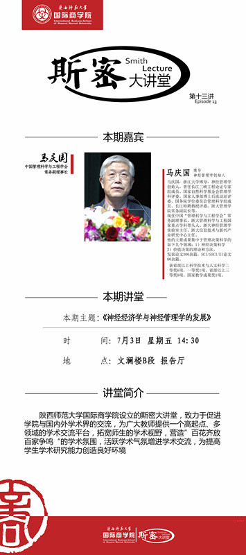 讲座题目:国际商学院斯密大讲堂第十三讲预告:神经经济学和神经管理学的发展
