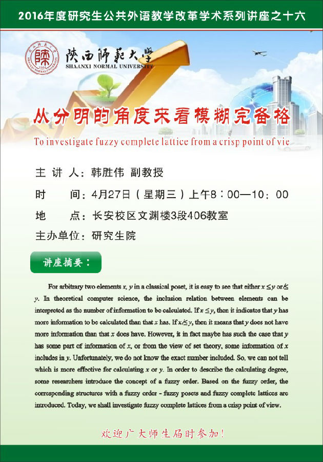 讲座题目:2016年度研究生公共外语教学改革学术系列讲座之十六:从分明的角度来看模糊完备格