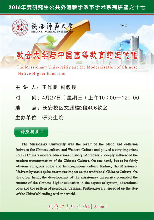 讲座题目:2016年度研究生公共外语教学改革学术系列讲座之十七:教会大学与中国高等教育的近代化