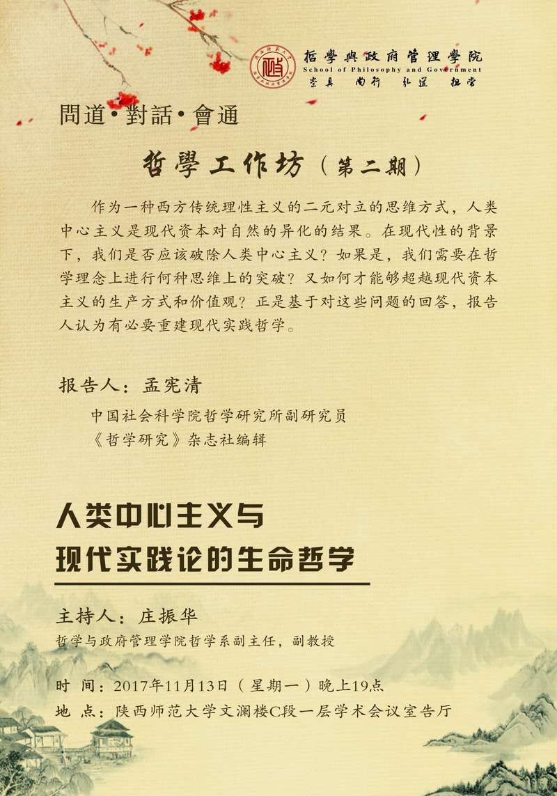 讲座题目:哲学工作坊第二期:人类中心主义与现代实践论的生命哲学